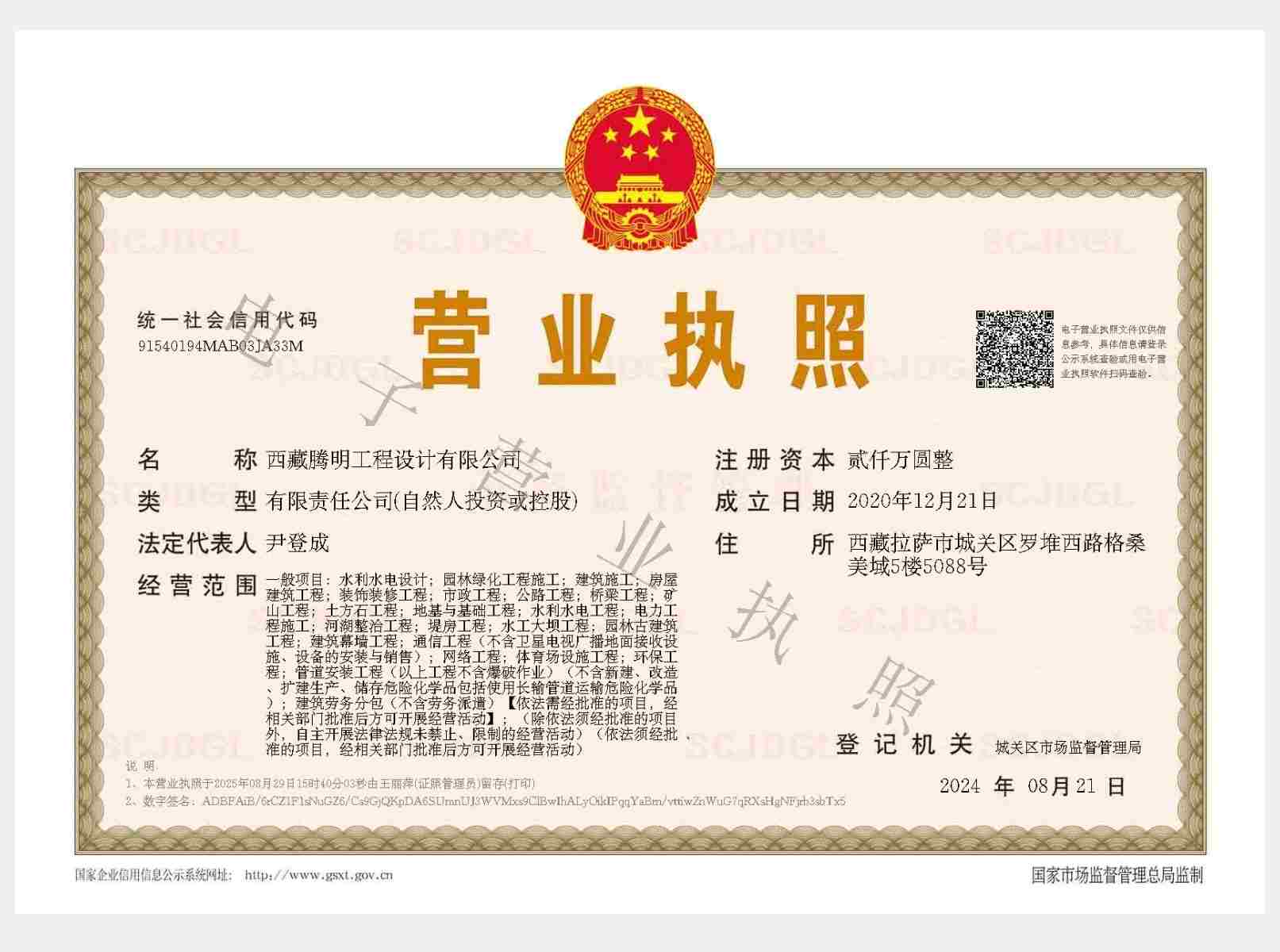 西藏腾明工程设计有限公司成立于2020年12月,注册资本伍仟万元。目前拥有水利工程施工监理乙级资质,是全国水利建设市场主体信用评价A级单位,并顺利通过了IS09001质量管理体系、1S014001环境管理体系认证及IS045001职业健康安全管理体系认证。公司组织机构健全,管理制度完善,技术力量雄厚,专业设备配备齐全,累计完成了青岛市小沽河防洪排涝及水源利用工程(莱西段)、济南市长清区王府河河道综合治理工程(EPC) 项目等二百余项工程业绩,在业内树立了良好的品牌和口碑。